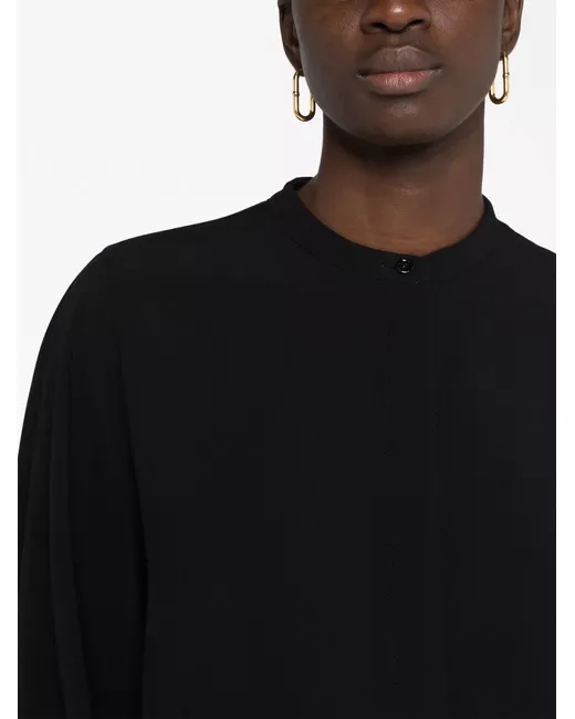Nero, design senza colletto, chiusura frontale con bottoni e maniche lunghe.