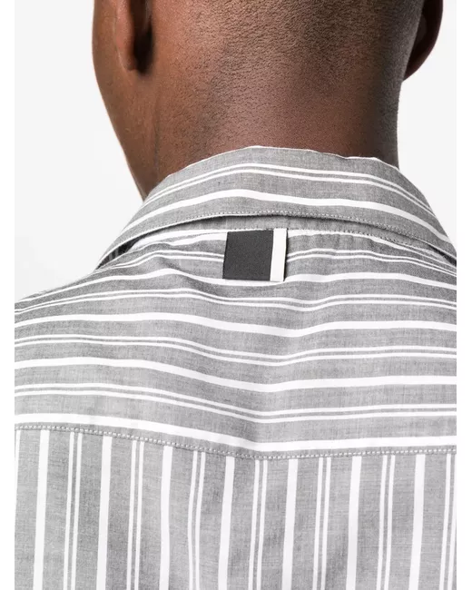 Grigio/bianco, motivo a righe verticali, colletto classico, chiusura frontale con bottoni, maniche corte, tasca applicata sul petto e orlo dritto. .