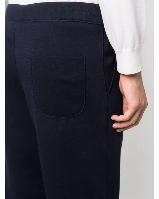 navy blue elasticated drawstring waistband two side inset pockets two rear patch pockets straight leg straight hem