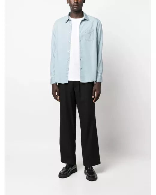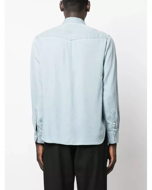 Blu chiaro, colletto a punta, chiusura frontale con bottoni, tasca applicata sul petto, maniche lunghe, orli con bottone e orlo dritto. .