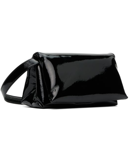 Padded patent faux-leather messenger bag in black. · Detachable shoulder strap · Logo embossed at back face · Foldover flap · Zip pocket at two-compartment interior · Grained faux-leather lining · Logo-engraved gold-tone hardware · H4.5 x W8 x D4 in Supplier color: Black