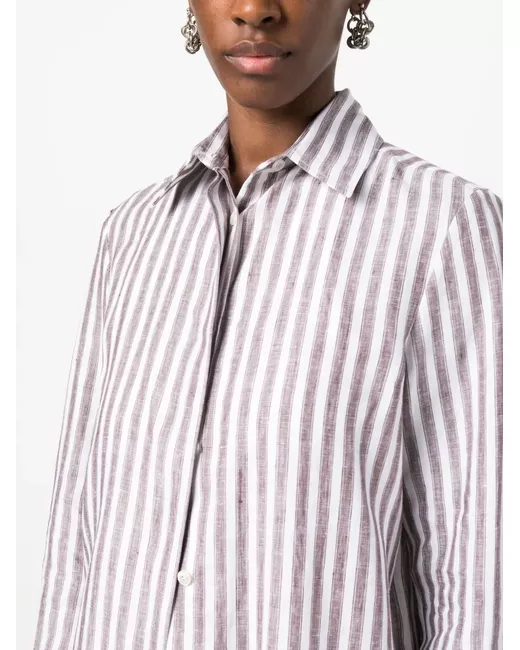 Bianco, motivo a righe verticali, colletto classico, maniche lunghe e chiusura frontale con bottoni. .