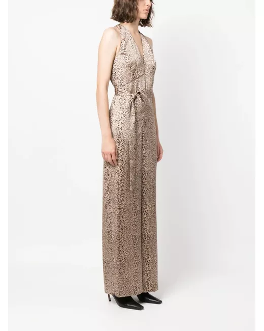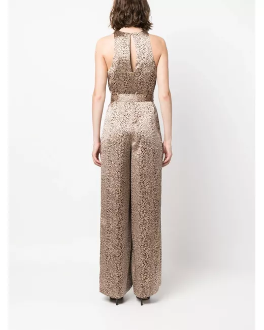 Marrone cedro, marrone chiaro, nero intenso, stampa leopardo all-over, finitura satinata, scollo profondo a V, senza maniche, modello con cintura, chiusura posteriore con bottone singolo e gamba ampia.
