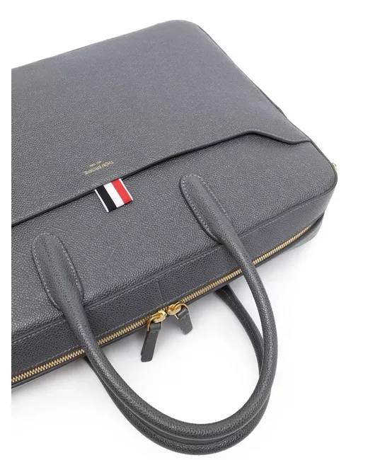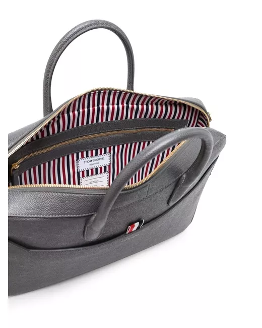 Trama zigrinata, logo ricamato, chiusura superiore con zip, dettagli color oro, manici rotondi, tracolla regolabile e rimovibile e tasca interna con zip.