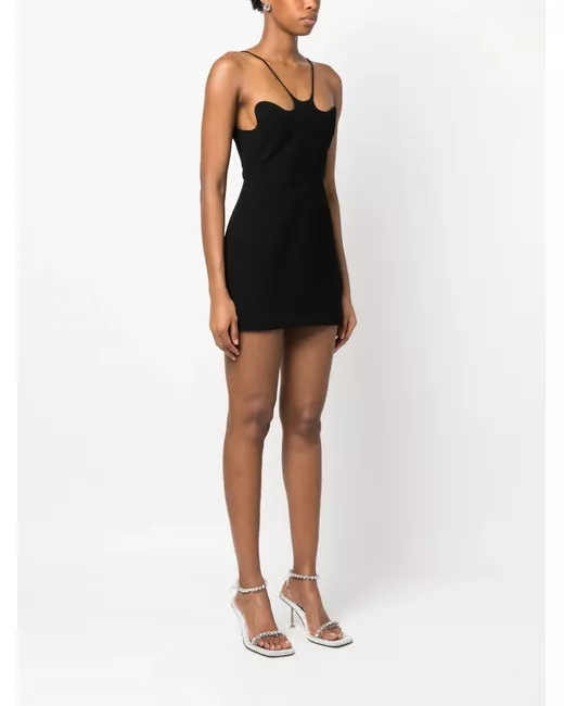 Nero, spalline sottili, angoli arrotondati, senza maniche, chiusura posteriore con zip nascosta, orlo dritto e lunghezza sopra il ginocchio.