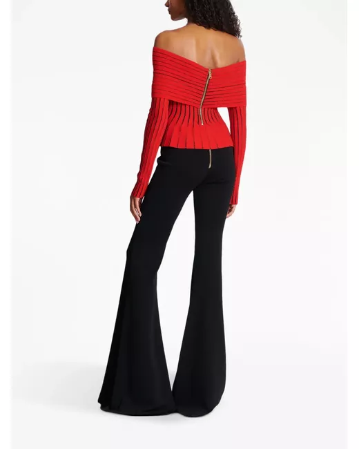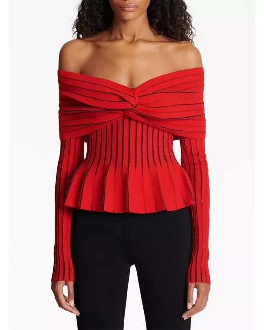 Rosso, dettaglio lurex, dettaglio drappeggiato, design intrecciato, design con spalle scoperte, maniche lunghe e design peplum.