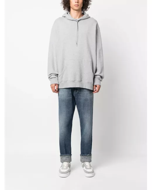 Blu, denim, effetto sbiadito, applicazione posteriore con logo, passanti, chiusura frontale con bottoni e zip, taglio straight, design classico a cinque tasche e orli arrotolati.