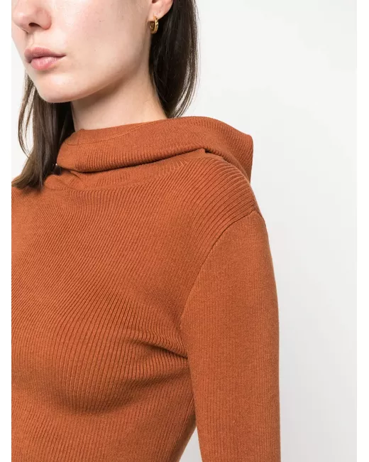 rust brown knitted construction pullover design classic hood extra-long sleeves cropped straight hem