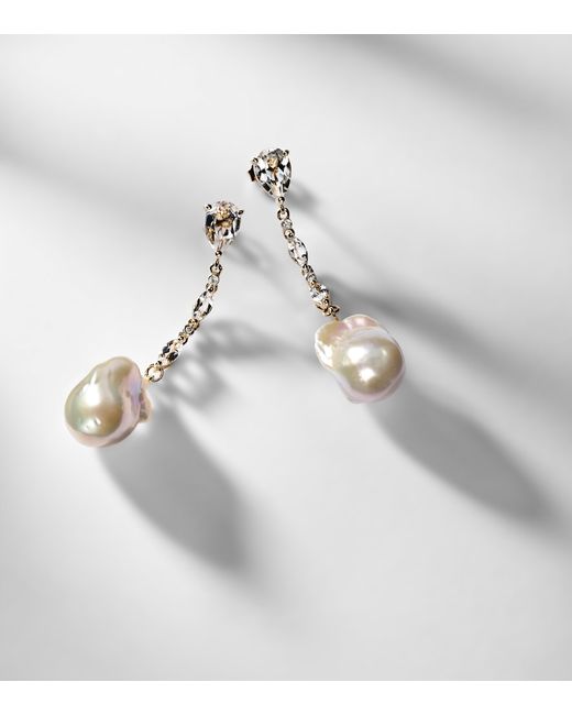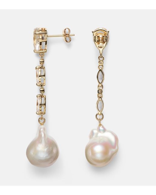 Materiale: oro giallo 14kt (585/1000). Made in USA. Pietra I: topazio, taglio a goccia, taglio marquise, montatura a griffe. Pietra II: diamanti bianchi, taglio rotondo, montatura a castone. Pietra II peso totale in carati (ctw): 0.4. Perla I: coltivata d'acqua dolce, barocca. Chiusura: chiusura posteriore a scatto. Colore del designer: yellow gold. Oro giallo. topazio, diamante, Perle.