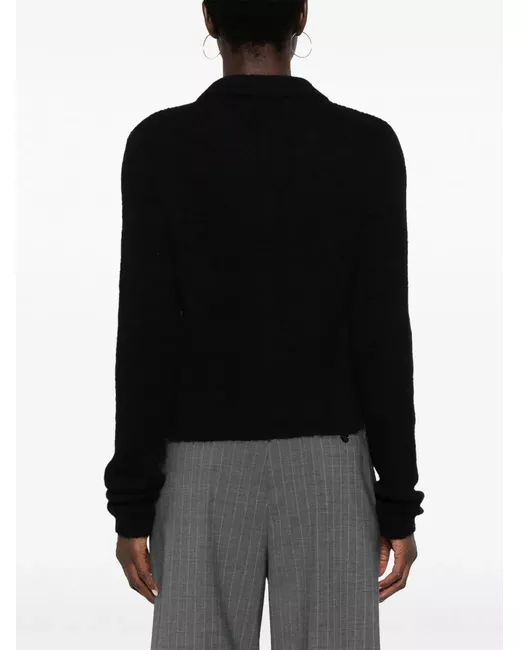 Nero, misto lana d'alpaca, lavorazione a coste, colletto a punta, chiusura frontale con bottoni, chiusura con bottoni in madreperla, maniche lunghe e orlo dritto.