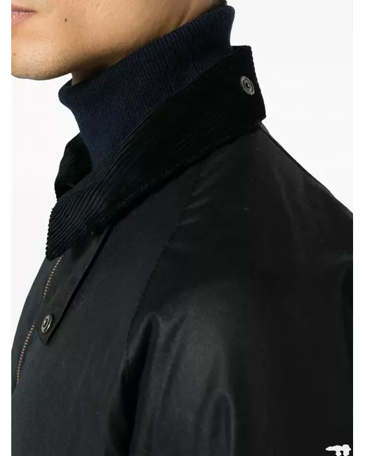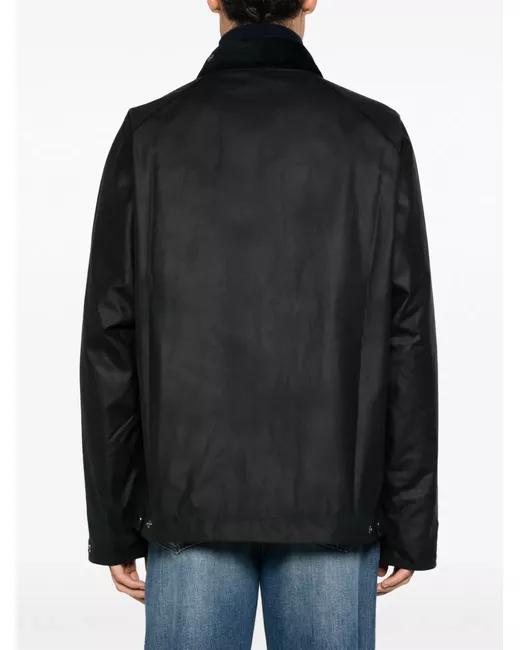 Blu navy, cuciture tono su tono, dettagli color argento, colletto a coste, chiusura frontale con zip a doppio cursore, maniche lunghe, orli con bottone, tasche frontali con patta e orlo dritto.
