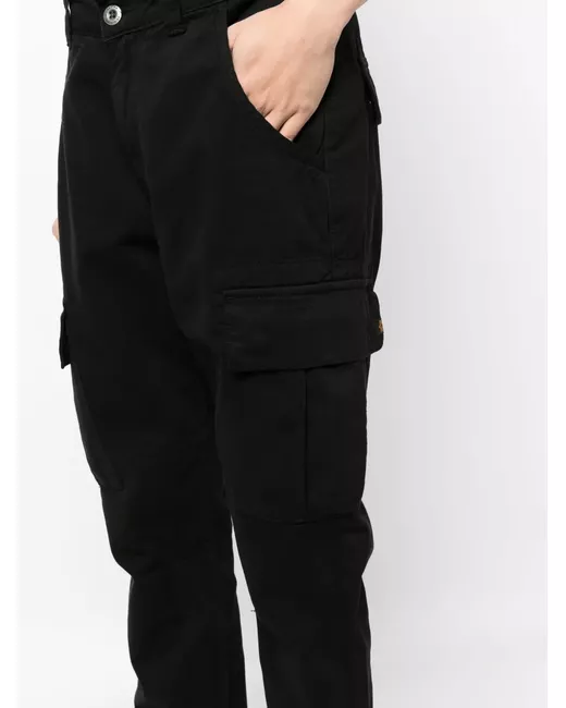 Nero, cotone, vita media, passanti, taglio straight, chiusura frontale con bottoni e zip, due tasche diagonali laterali e due tasche posteriori con patte.