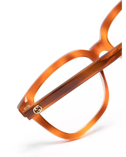 Havana brown tortoiseshell effect clear lenses square frame raised bridge straight arms curved tips These glasses come with a protective case. All glasses from FARFETCH are sold as non-prescription frames.