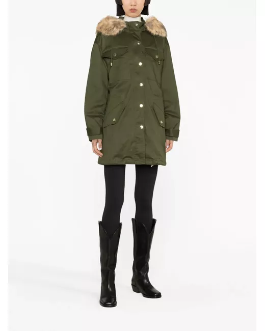Verde scuro, cotone biologico elasticizzato, cappuccio con bordo in finta pelliccia, cappuccio rimovibile, colletto rialzato, chiusura frontale con bottoni a pressione e zip, maniche lunghe, orli con cintura, due tasche con patta sul petto, due tasche laterali con patta, orlo con coulisse e orlo dritto.