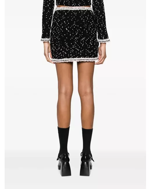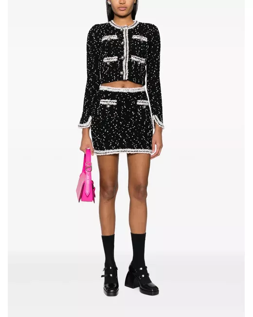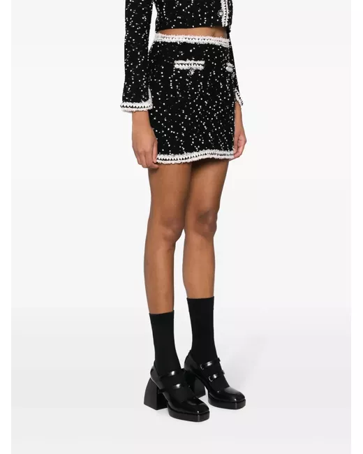 Nero, misto lana e cotone, design lavorato a maglia, bordo a contrasto, vita alta, due tasche con bottone e orlo dritto.