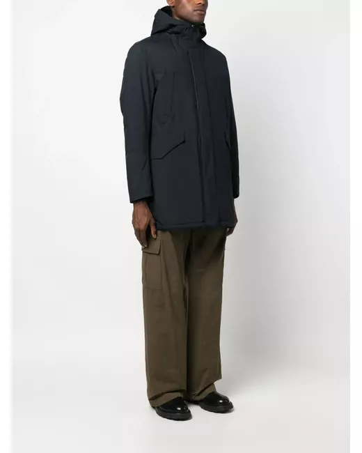 Blu navy, piumino, cappuccio, chiusura frontale nascosta, maniche lunghe, due tasche frontali con pattina e orlo dritto.