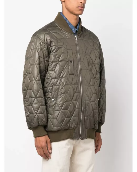 khaki wool blend quilted patterned intarsia knit reversible ribbed band collar long sleeves stud-fastening chest pocket two side stud-fastening pockets ribbed cuffs and hem