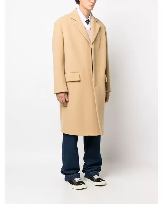 beige virgin wool blend notched lapels concealed front button fastening long sleeves buttoned cuffs front flap pockets straight hem central rear vent full lining knee-length