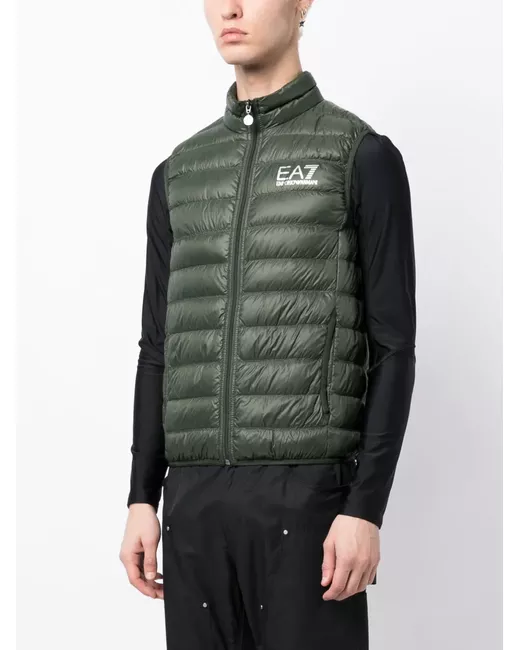 Verde felce, piumino d'anatra, design imbottito, stampa con logo sul petto, collo a imbuto, chiusura frontale con zip, senza maniche e due tasche con inserti.