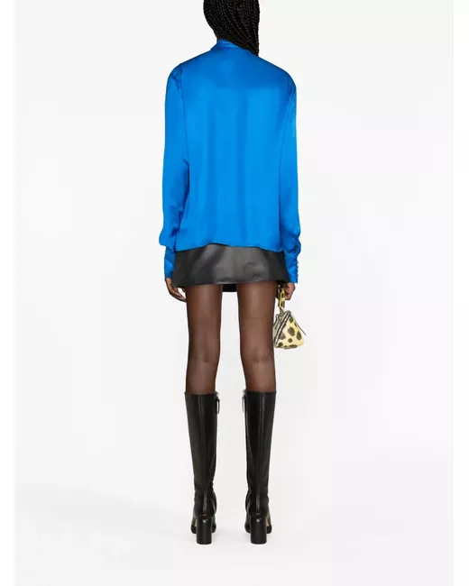 Blu cobalto, tessuto in raso, colletto con fiocco, chiusura frontale con bottoni, maniche lunghe, orli con bottone e orlo dritto.