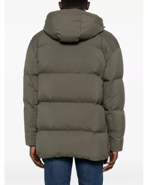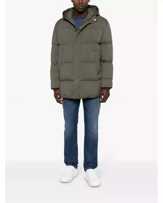 olive green down-feather filling padded design high neck classic hood concealed front fastening concealed side zip fastening long sleeves elasticated cuffs two side welt pockets straight hem