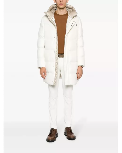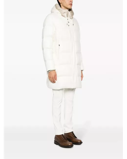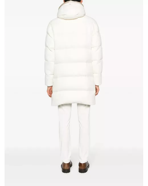 Bianco ottico, color sabbia, misto cashmere e seta, imbottitura in piuma d'oca, tessuto in twill, finitura imbottita, placca con logo color argento, cappuccio con coulisse, collo a imbuto, chiusura frontale nascosta con bottoni a pressione, maniche lunghe, polsini elasticizzati, due tasche laterali con zip, orlo dritto e lunghezza al ginocchio.