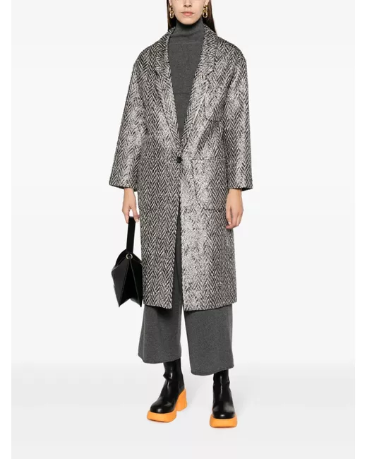 cool grey herringbone shawl lapels front button fastening drop shoulder long sleeves three front patch pockets calf-length