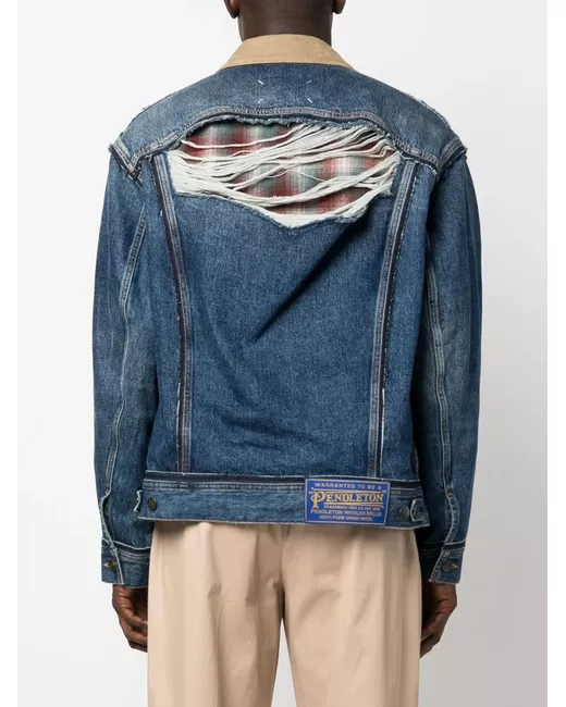 indigo blue cotton/wool denim ripped detailing logo patch to the rear corduroy collar long sleeves buttoned cuffs front button fastening two front patch pockets straight hem