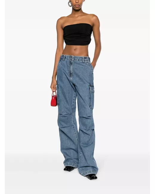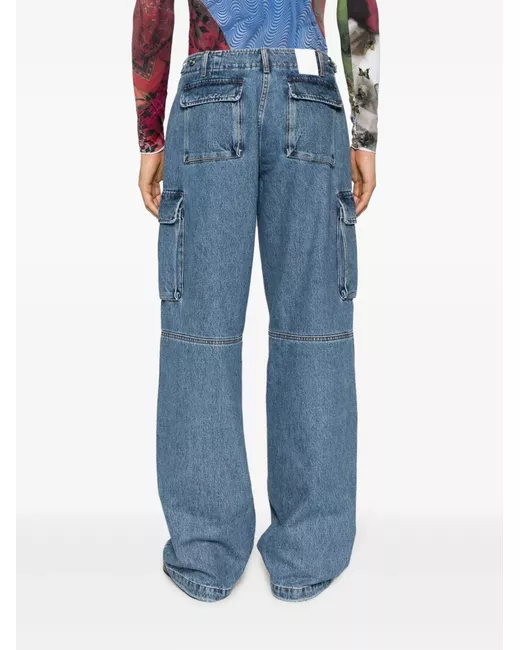 Blu, cotone, vita alta, gamba ampia, applicazione posteriore con logo, due tasche laterali cargo, due tasche posteriori con patte, passanti, chiusura con bottone e zip nascosta e applicazione laterale con logo.