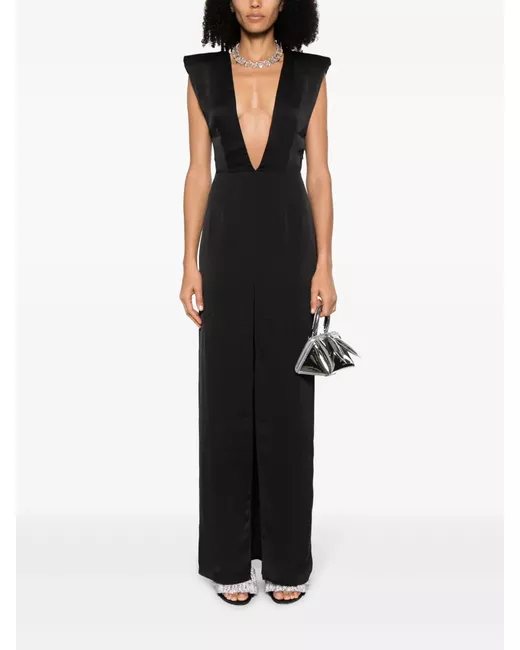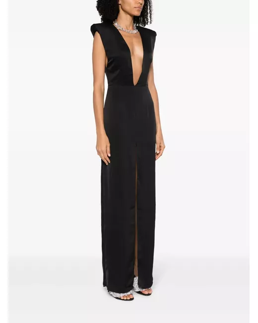 Nero, tessuto in raso, scollo profondo a V, scollo a V sulla schiena, chiusura laterale con zip nascosta, spalline, senza maniche, taglio nella parte anteriore e design lungo.