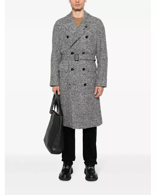 black/white alpaca wool-blend tweed notched lapels double-breasted button fastening belted waist two front flap pockets long sleeves straight hem