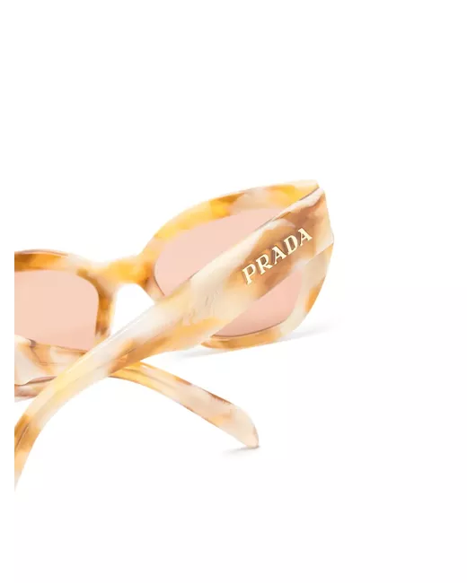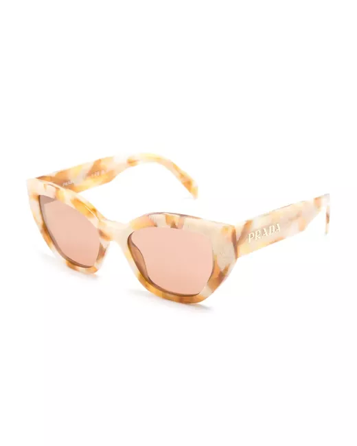 Beige, marrone chiaro, acetato, montatura a farfalla, logo in lettere color oro, aste scolpite, aste con punta curva, lenti con protezione UV, fantasia astratta e lenti arancioni. Questi occhiali sono forniti con una custodia protettiva.