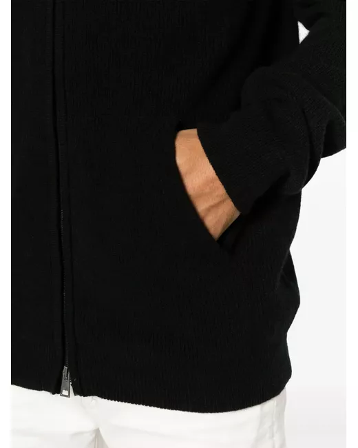black merino wool-cashmere blend fine ribbed classic hood high neck long sleeves front zip fastening two side inset pockets straight hem