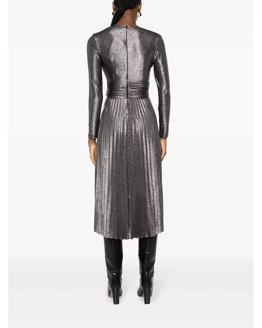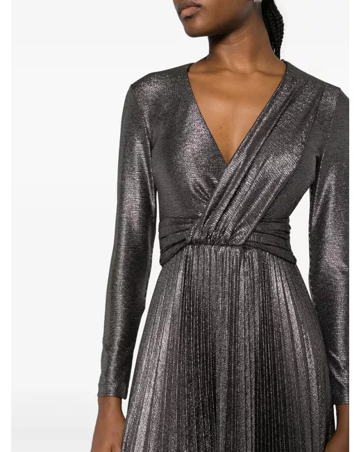 Color argento, effetto lamé, dettaglio con arricciature, scollo profondo a V, chiusura posteriore con zip nascosta, maniche lunghe, gonna plissettata, orlo svasato e lunghezza sotto al ginocchio.