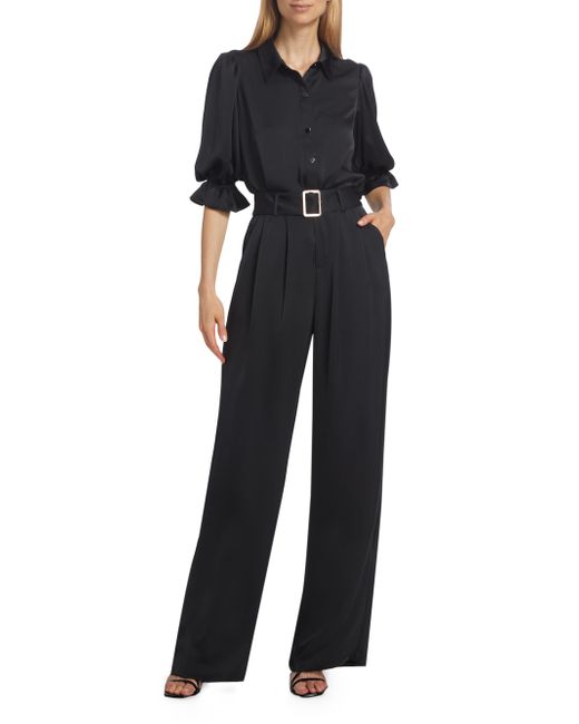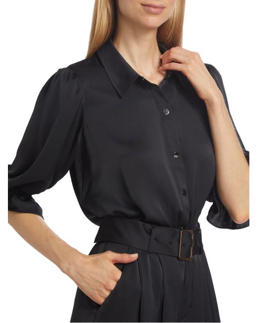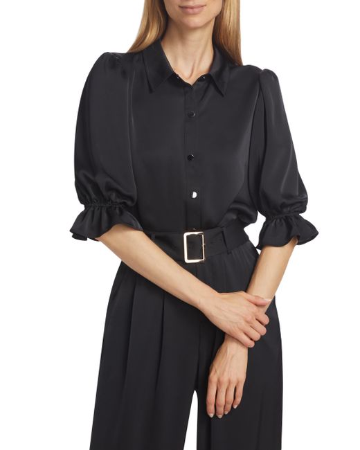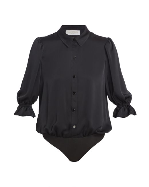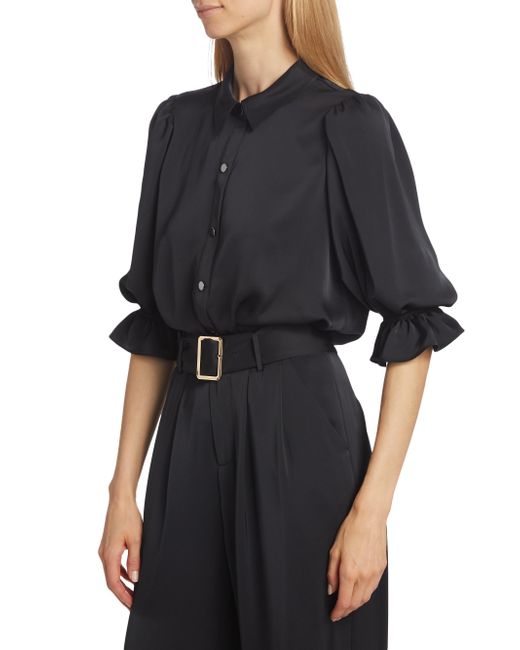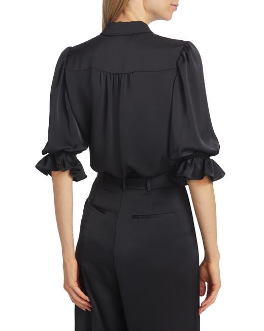 Ramy Brook's Dina bodysuit showcases a billowing bodice tailored with a point collar and flared cuffs. Framed by elbow-length sleeves, this piece features a shiny snap front design. Point collar Elbow-length sleeves, elasticized flare cuffs Shirred back yoke Snap front closure 100% polyester Dry clean Imported SIZE & FIT About 25" from shoulder to hem Model measurements: 5'10" tall Model is wearing a US size Small. Contemporary Sportswear - Contemporary Collections > Ramy Brook > Saks Fifth Avenue > Barneys. Ramy Brook. Color: Black. Size: Small.