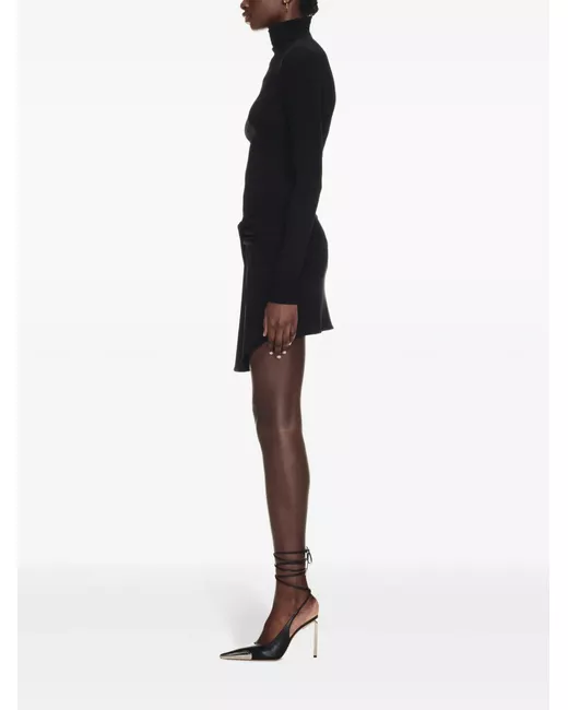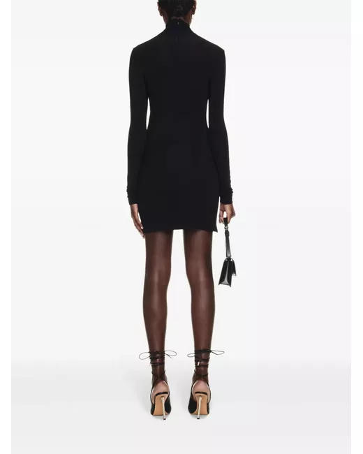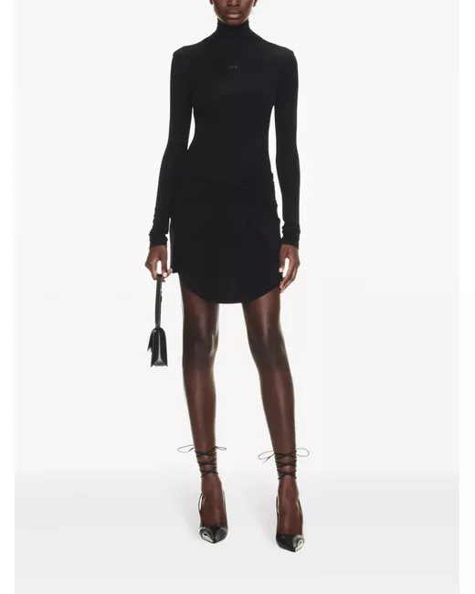 Nero, trama effetto crêpe, design elasticizzato, collo alto, maniche lunghe, stampa con logo frontale, design attorcigliato, lunghezza sopra il ginocchio e orlo curvo.