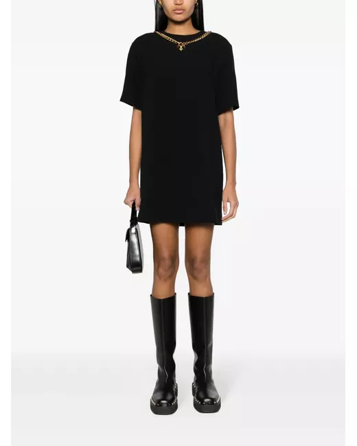 nero intenso trama effetto crêpe ciondolo a cuore scollo rotondo chiusura posteriore con zip nascosta maniche con spalle scese maniche corte orlo dritto altezza sopra al ginocchio fodera integrale
