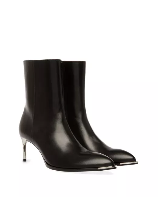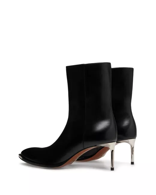 Nero, pelle di vitello, finitura lucida, dettagli color argento, design a punta, lunghezza alla caviglia, design pull on, tacco a stiletto e suola in pelle.