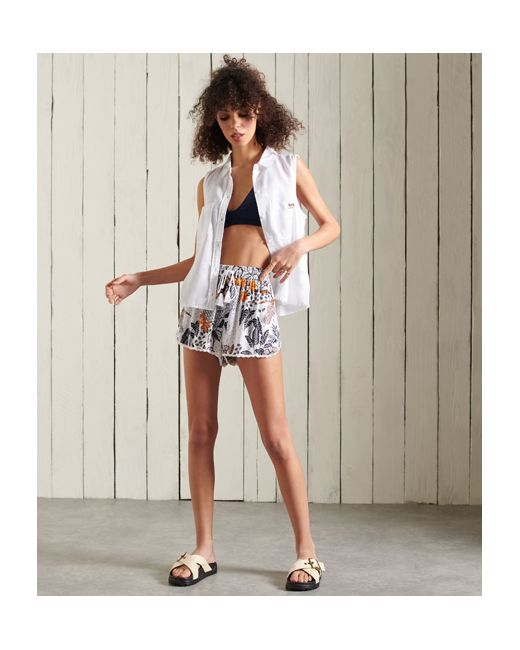 The perfect beach companion the Beach Shorts feature a drawstring waist, lace trim, two side pockets and a metal logo tab. Relaxed fit - the classic Superdry fit. Not too slim, not too loose, just right. Go for your normal size Drawstring waist Two side pockets Lace trim Metal logo tab All over print