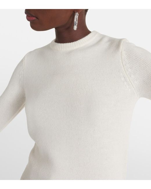 Material: 100% cashmere. Care instructions: dry clean. Made in China. Designer color name: Ivory. Hem: ribbed. Cuff: ribbed. Collar: crewneck.
