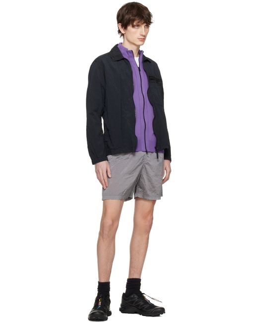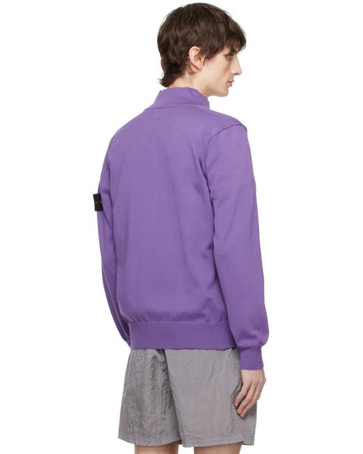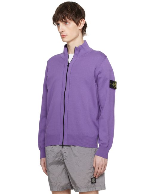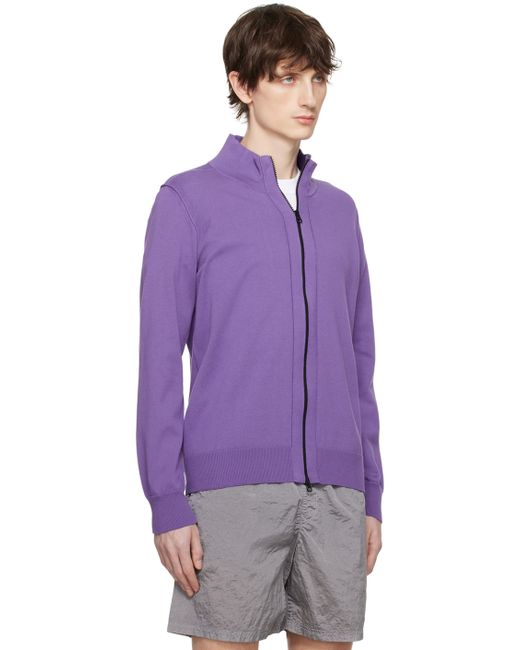 Knit organic cotton sweater. · Rib knit stand collar, hem, and cuffs · Two-way zip closure · Detachable felted logo patch at sleeve Supplier color: Lavender Supplier code: 8015542B2