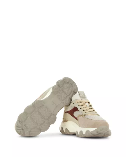beige lino camoscio design a inserti applicazione sulla linguetta con logo chiusura frontale con lacci punta tonda suola chunky in gomma
