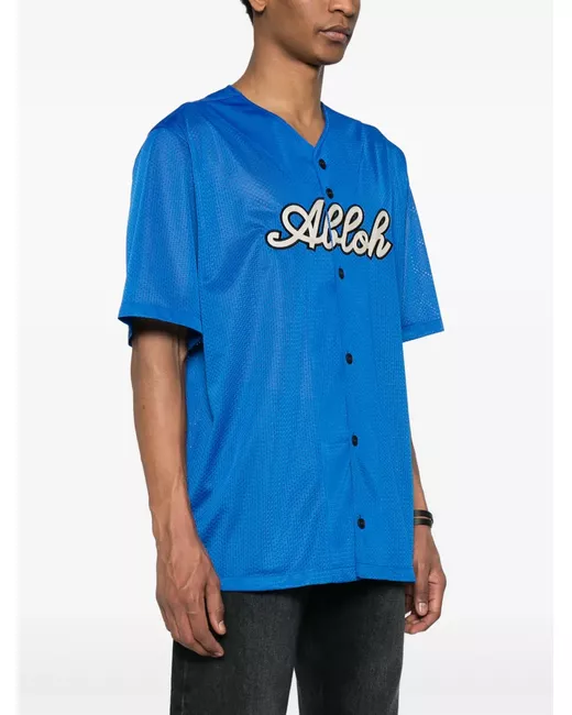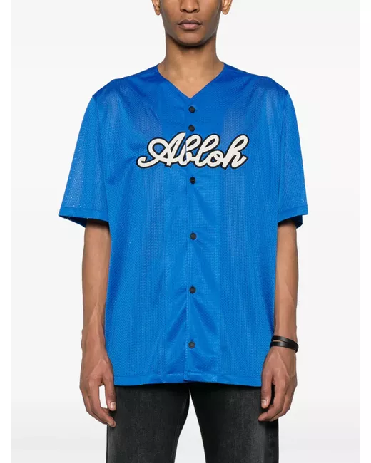 blue fully perforated V-neck short sleeves logo patch at the chest logo patch to the rear straight hem front button fastening