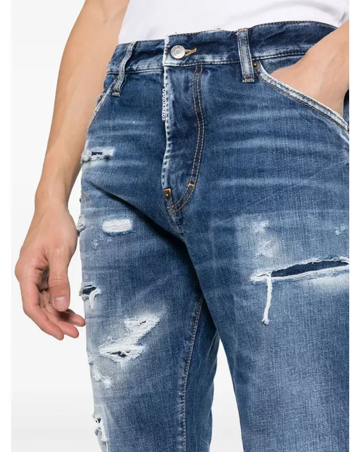blue cotton denim distressed effect ripped detailing mini logo tag at the zip fly leather appliqué-logo to the rear belt loops at the waist classic five-pocket design button and concealed zip fly fastening