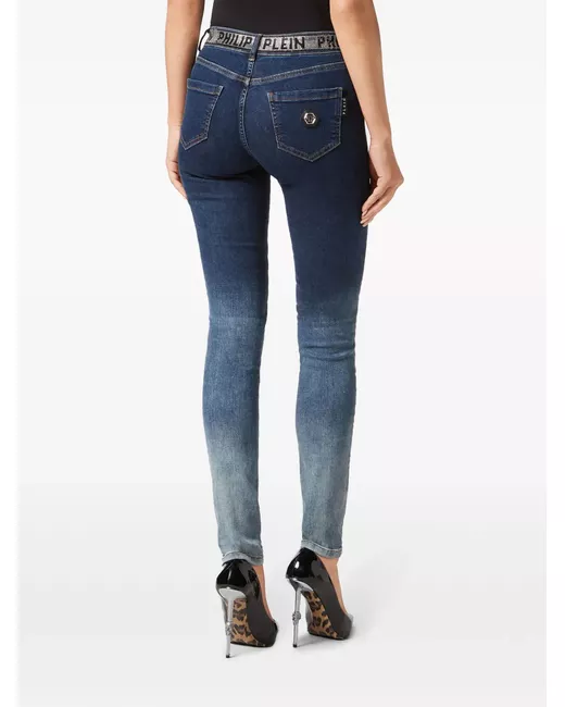 indigo blue/light blue stretch-cotton washed denim gradient effect rhinestone embellishment logo embellishment logo patch to the rear mid-rise front button and zip fastening belt loops classic five pockets skinny cut straight hem