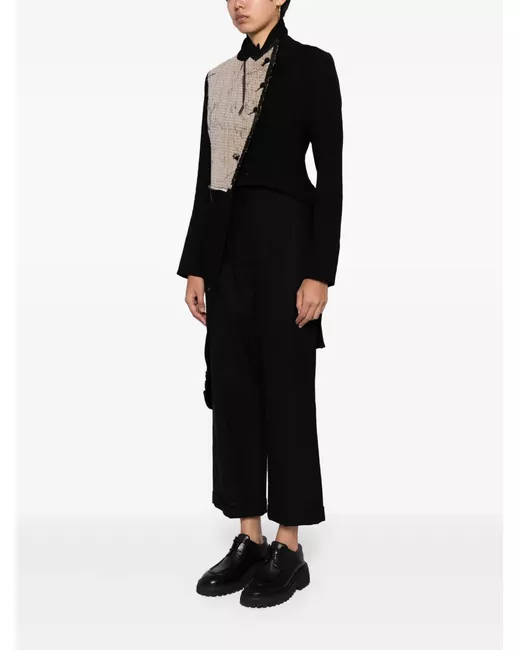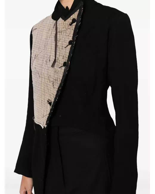 black/sand beige wool decorative stitching contrasting panel detail high neck off-centre front button fastening long sleeves chest welt pocket side flap pocket asymmetric hem