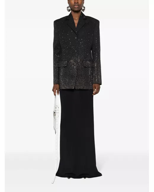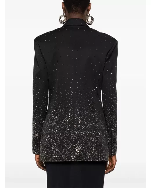 black wool twill weave tailored design crystal embellishment notched lapels shoulder pads long sleeves buttoned cuffs two front flap pockets American rear vent logo-jacquard lining front button fastening