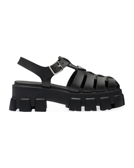The chunky yet lightweight design of the iconic Monolith sole made of rubber is an expression of a timeless design, monolithic and unique, that reimagines Prada's dual soul with a modernist twist. Made of rubber for a fun, contemporary look, the silhouette reinterprets retro beach footwear in a totally new way that reflect Prada's hybrid soul. Upper with metal buckle Enameled metal triangle logo Rubber sole: 55 mm / 2.1'' Fabric pouch not included in the packaging Made in Italy. Lsd Rtw - Prada Rtw > Prada > Saks Fifth Avenue > Barneys. Prada. Color: Black. Size: 10.