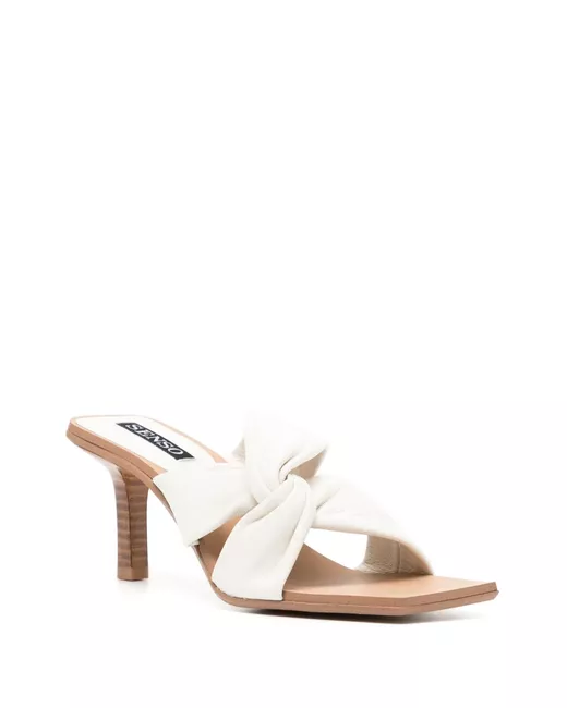 bianco pelle dettaglio con nodo punta squadrata aperta design slip-on soletta con logo tacco alto