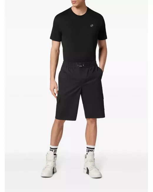 black cotton elasticated drawstring waistband two side inset pockets two side flap pockets rear jetted pocket straight hem